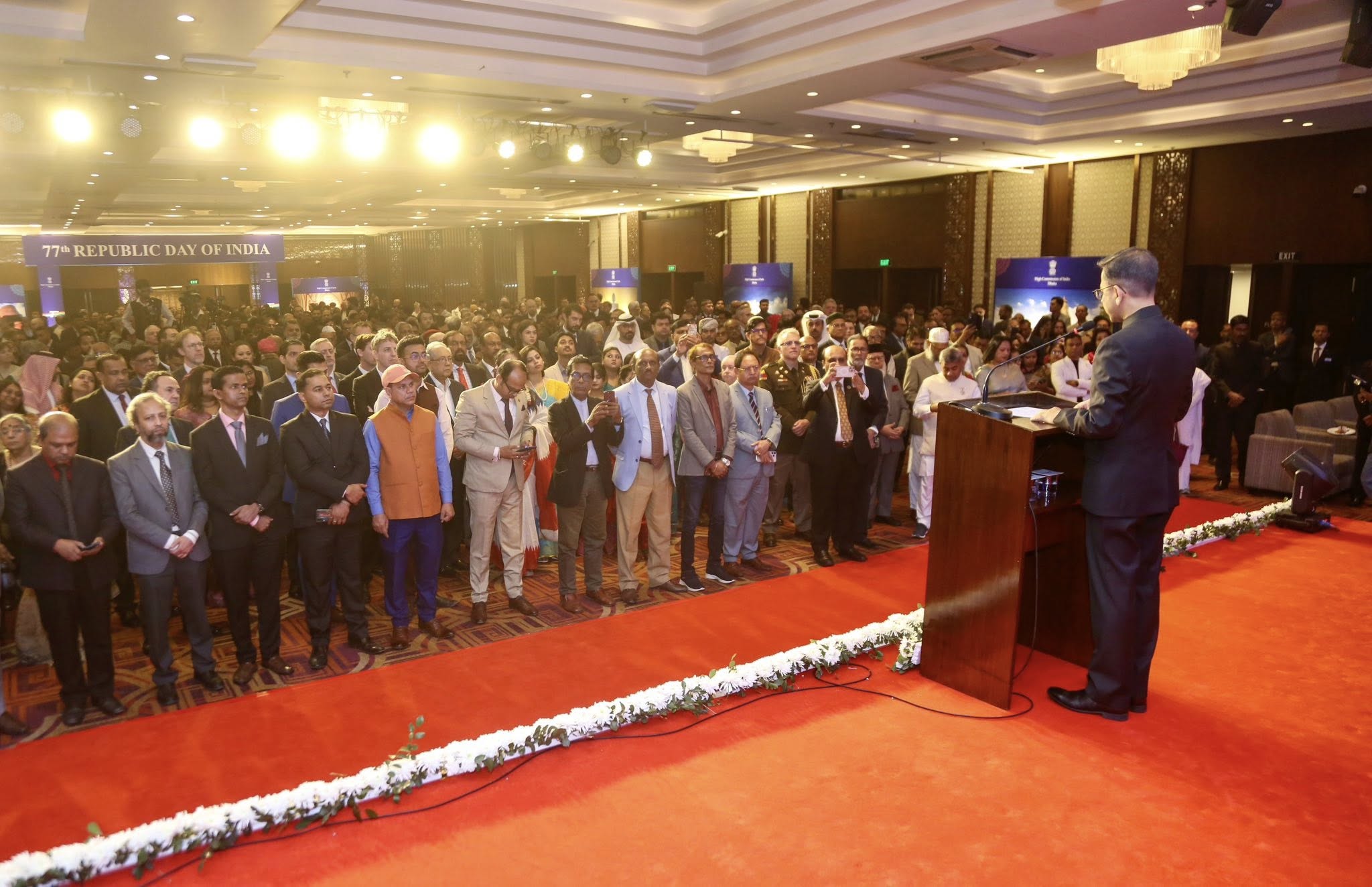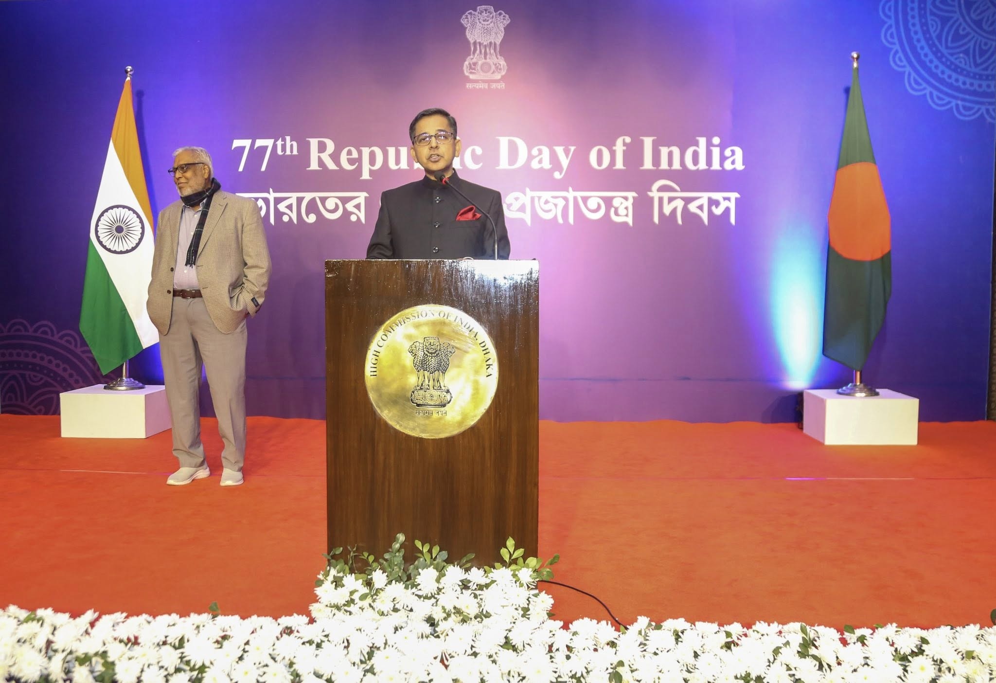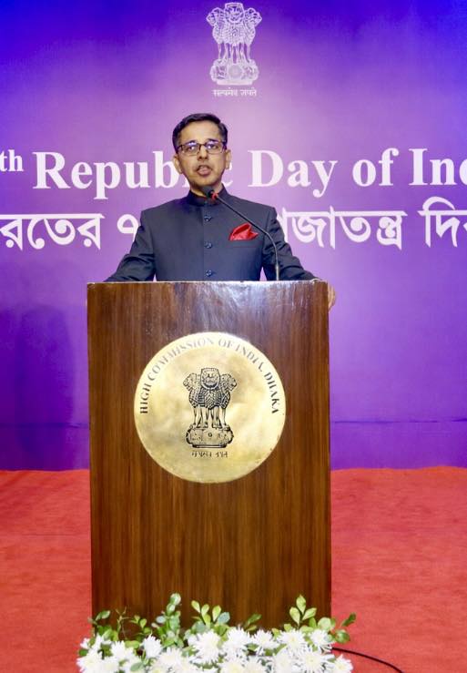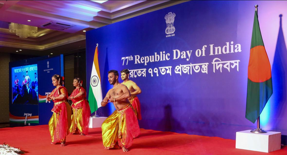 ভারতের ৭৭তম প্রজাতন্ত্র দিবস উপলক্ষ্যে ভারতীয় হাই কমিশন ২৪ জানুয়ারি ২০২৬-এ ঢাকায় একটি সংবর্ধনা অনুষ্ঠানের আয়োজন করে। বাংলাদেশ সরকারের বিদ্যুৎ, জ্বালানি ও খনিজ সম্পদ বিষয়ক মাননীয় উপদেষ্টা মুহাম্মদ ফাওজুল কবির খান প্রধান অতিথি হিসেবে এতে উপস্থিত ছিলেন। হাই কমিশনার প্রণয় ভার্মা তাঁর বক্তব্যে একটি গণতান্ত্রিক, স্থিতিশীল, শান্তিপূর্ণ, প্রগতিশীল ও অন্তর্ভুক্তিমূলক বাংলাদেশের প্রতি ভারতের সমর্থনের কথা উল্লেখ করেন। তিনি এই দুই দেশের মাঝে বিদ্যমান গভীর ঐতিহাসিক ও সাংস্কৃতিক বন্ধনের কথা তুলে ধরেন এবং সমৃদ্ধি, অগ্রগতি ও অংশীদারিত্বের জন্য তাদের অভিন্ন আকাঙ্ক্ষার ভিত্তিতে প্রতিষ্ঠিত ভবিষ্যতমুখী সহযোগিতার গুরুত্বের ওপর জোর দেন। বিভিন্ন রাজনৈতিক দলের নেতৃবৃন্দ, বাংলাদেশ সরকারের ঊর্ধ্বতন কর্মকর্তাগণ ও সশস্ত্র বাহিনীর জ্যেষ্ঠ সদস্যগণ; ব্যবসায়িক প্রতিষ্ঠান, সুশীল সমাজ, গণমাধ্যম, শিক্ষাবিদ, চিন্তাবিদ ও সাংস্কৃতিক সংগঠনের প্রতিনিধিগণের পাশাপাশি কূটনৈতিক মহলের সদস্যবৃন্দসহ সমাজের সকল স্তরের অতিথিগণ এই উদ্যাপনে অংশগ্রহণ করেন।