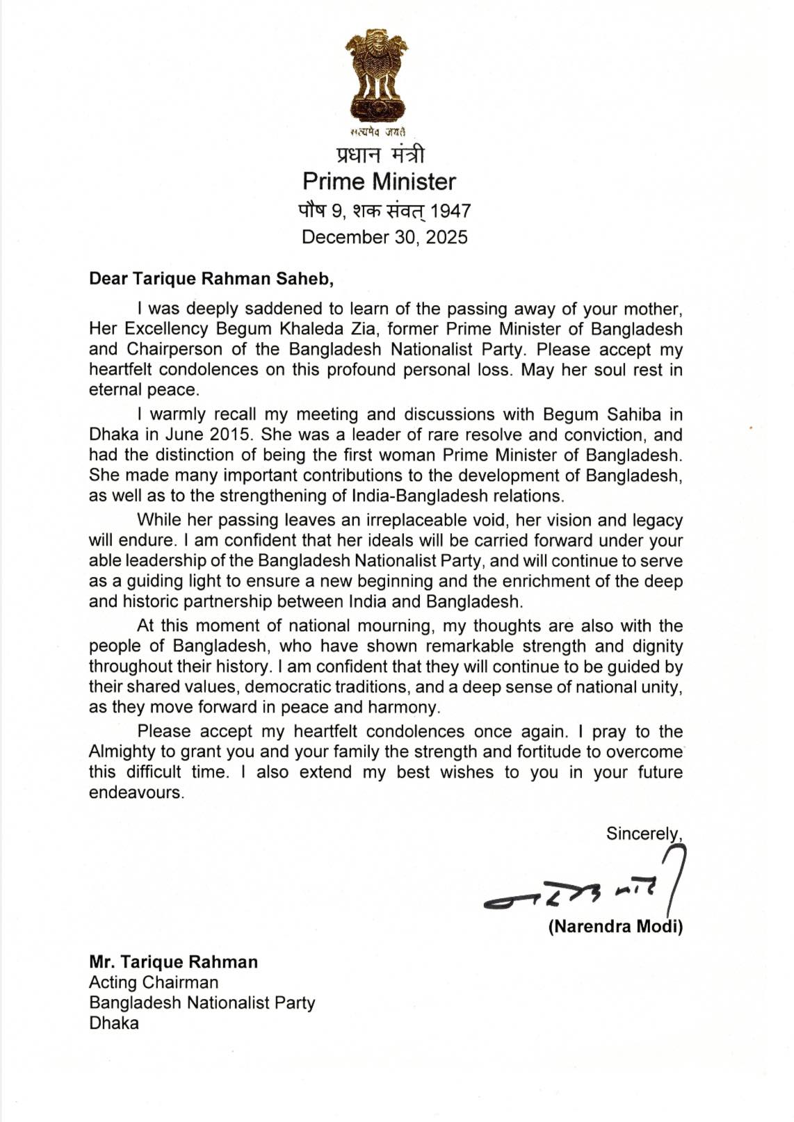 বিএনপির ভারপ্রাপ্ত চেয়ারম্যান জনাব তারেক রহমানকে প্রধানমন্ত্রী নরেন্দ্র মোদীর লেখা শোকবার্তার মূল অংশ নিম্নরূপ-