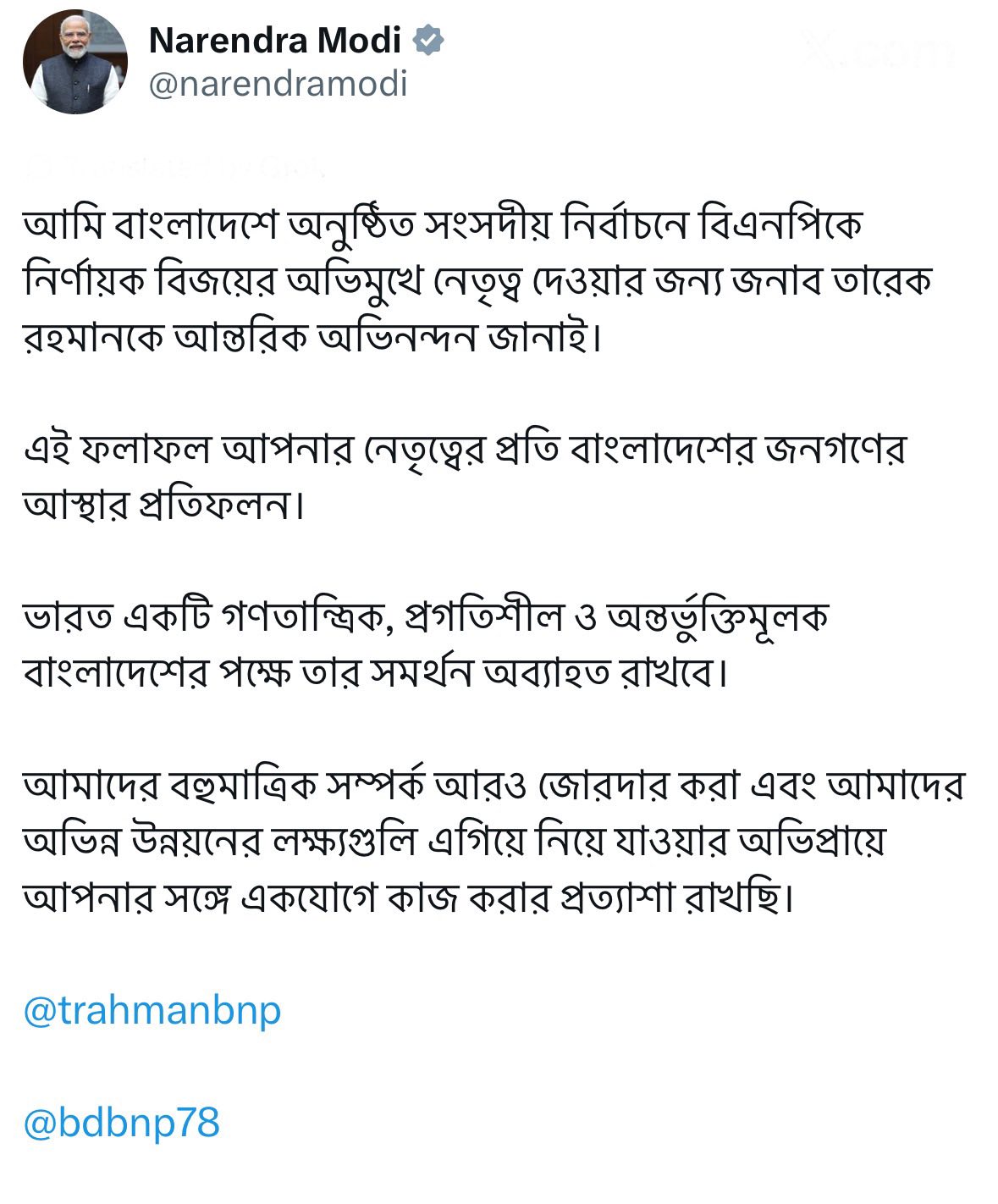 Prime Minister Shri Narendra Modi congratulates BNP Chairman Mr. Tarique Rahman